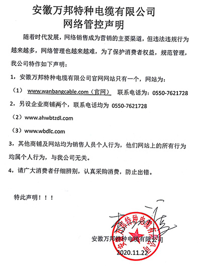 鄭重聲明:安徽萬邦特種電纜有限公司官方網站為:www_wanbangcable_com.jzbiz.com,除此之外無任何子網站或合作網站,其余均為假冒偽劣。電話:0550-7621728 13485756353 地 址:安徽省天長市滁州高新技術產業開發區經四路29號